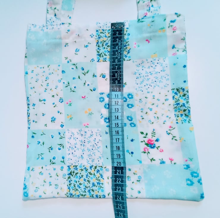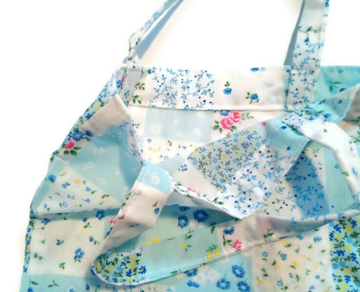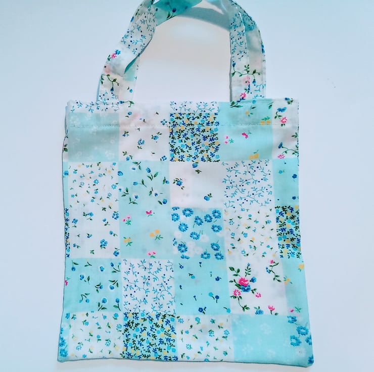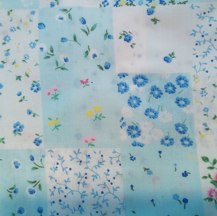 A pale blue patchwork design print in a variety of florals.