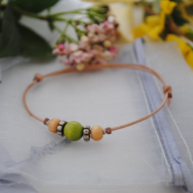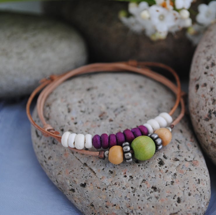 Two friendship bracelets made with natural leather 1) with wooden beads and silver-plated daisy spacers.2) with purple and white coco pucalet beads (coconut shell).