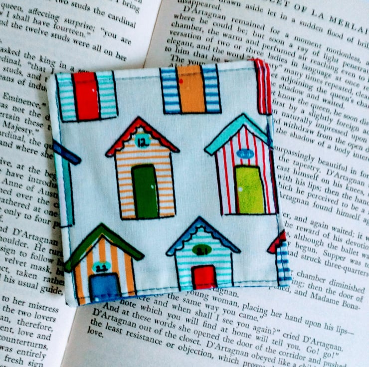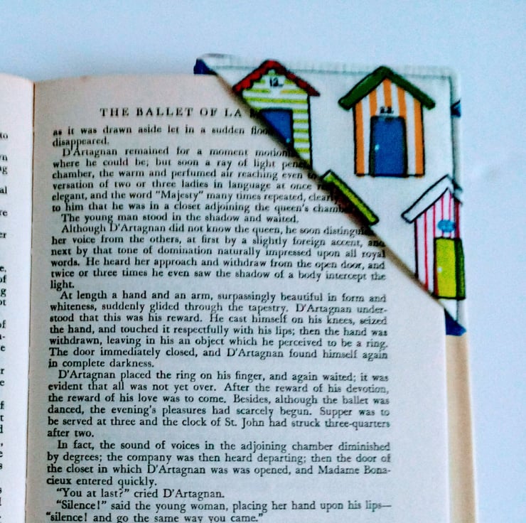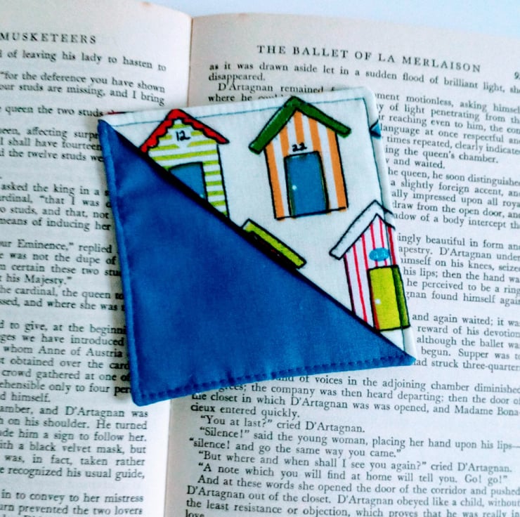 This is a cloth corner bookmark which is approx 3.5" square and fits over the corner of the page you want to bookmark. Doesn't fall out, so good for when travelling.