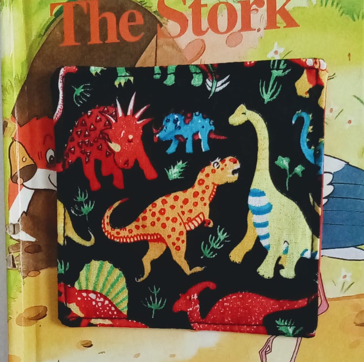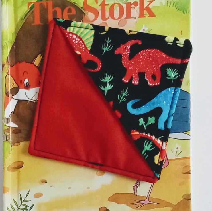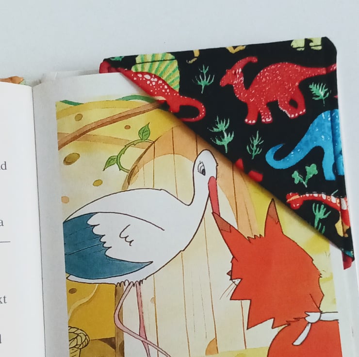 This is a cloth corner bookmark which is approx 3.5" square and fits over the corner of the page you want to bookmark. Doesn't fall out, so good for when travelling.