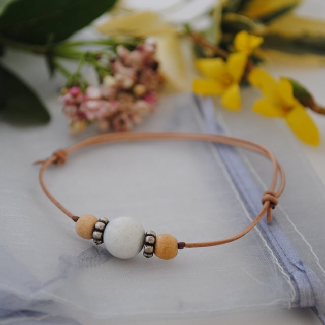 A simple friendship bracelet made with natural leather with a pale blue lava bead, wood beads and silver-plated daisy spacers.