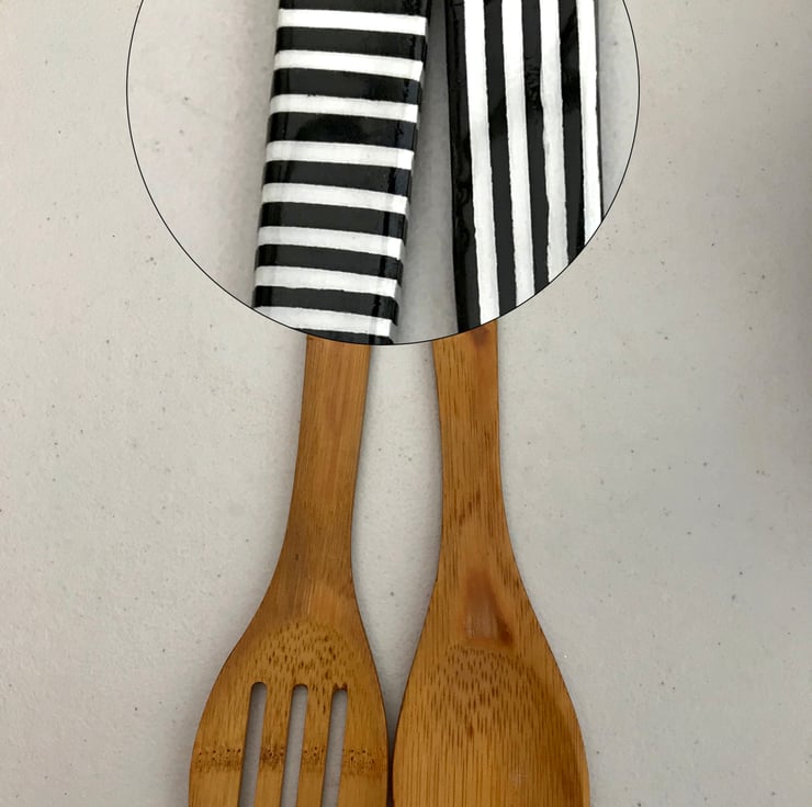 Take a humble pair of spoons, stir in a lot of love, a soupçon of design, a generous amount of patience, a pinch of time, liquorice-black & milk-white stripes and voilá! These are truly one-off one-of-a-kind spoons. I call them Salad Servers, but they could be used for anything.