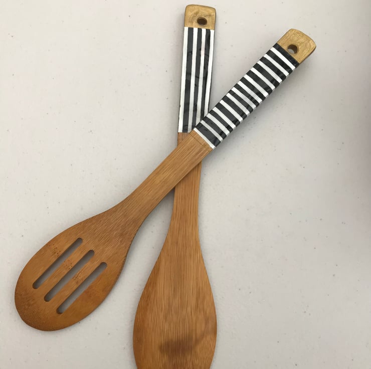 A set of 2 wooden spoons, ideal for use as Salad Servers, or for any other culinary purpose. They are 12" long. The gold-tipped handles have been carefully hand painted in a black and white striped design, and then finished in a hard high-gloss resin. The spoon-ends have been treated with a food safe “Butchers Block” oil. Hand wash only.