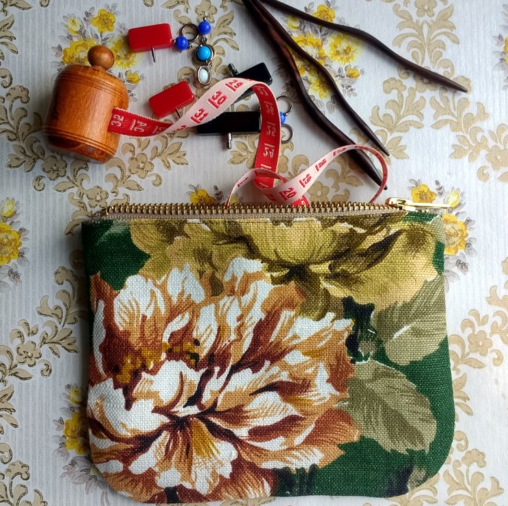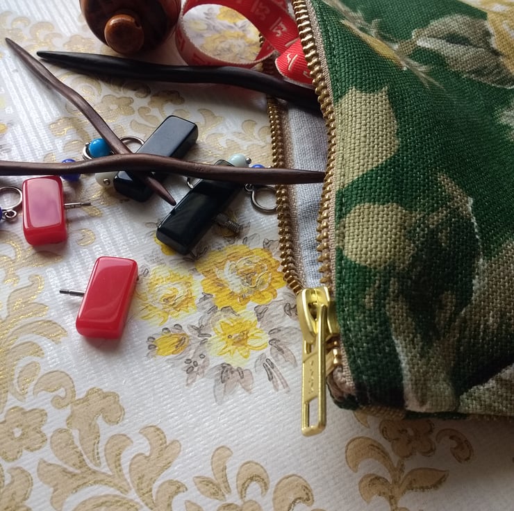 Fully lined with a light grey linen, the pouch has rounded corners and measures approx 16 x13 cm (6 1/2 by 5 inches) and closes with a metal YKK soft gold coloured zip and will hold a variety of knitting and crochet notions and what nots,