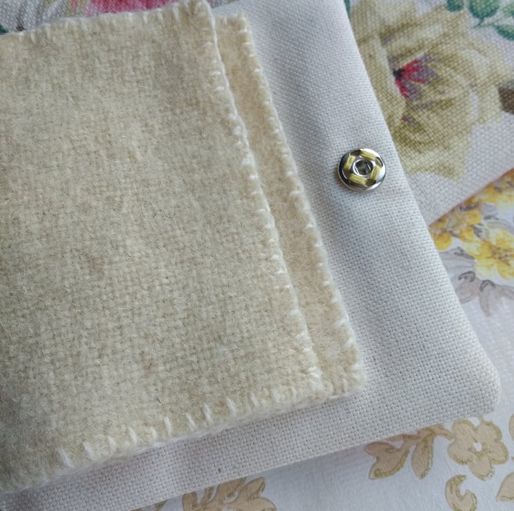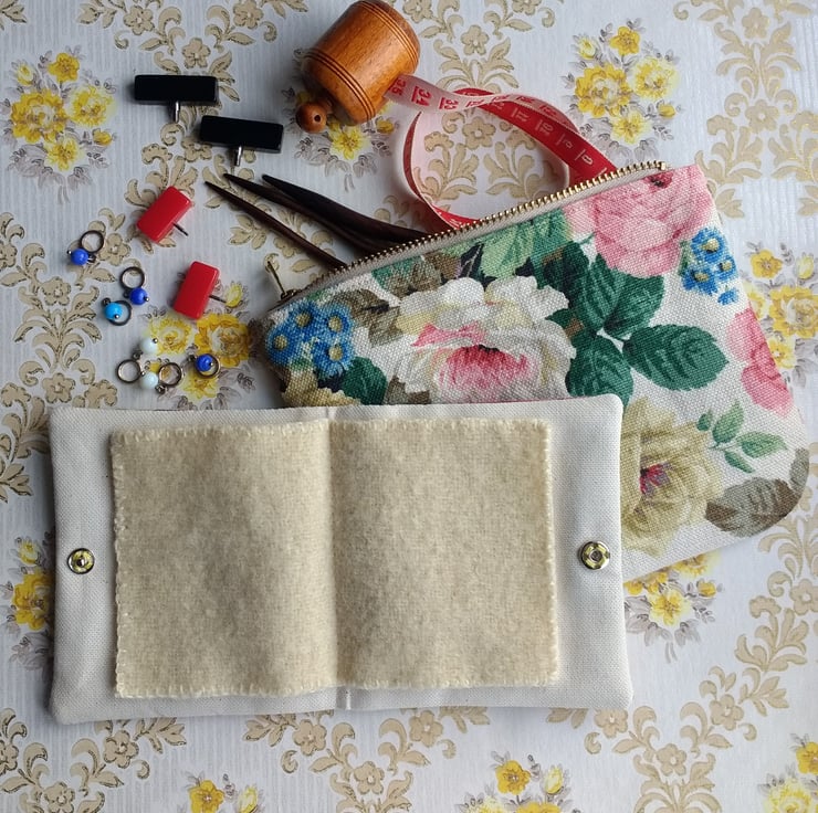 Between the outer and lining fabric is a piece of fleece made from natural fibres so the needlecase is nice and plump. Needles can also be pinned to the lining, the layer of fleece will help prevent them poking through to the front and is kept closed with a pair of hand sewn vintage snap fasteners.