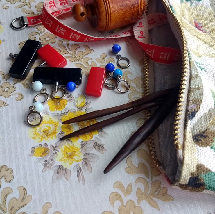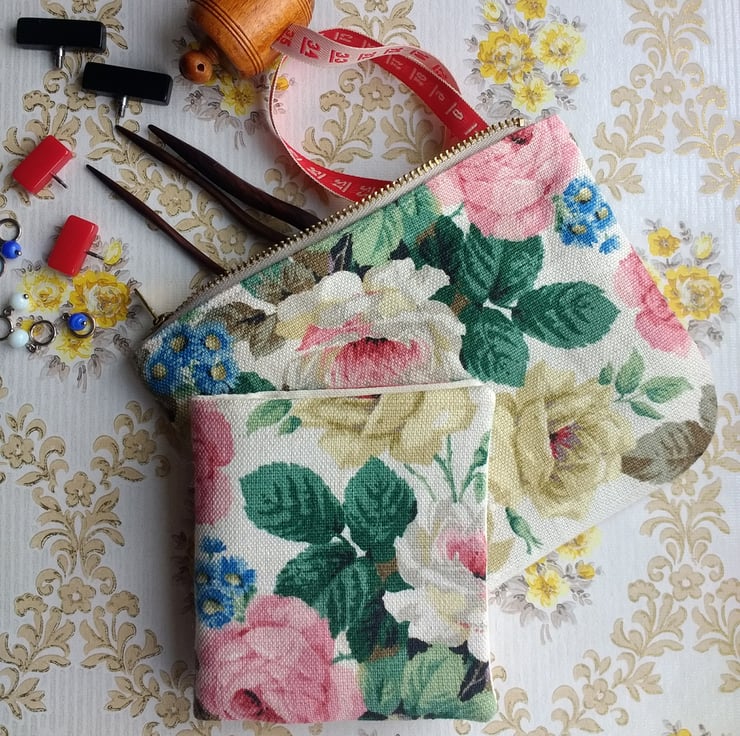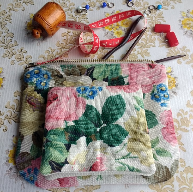 With a pretty floral print for the main fabric, and then fully lined with a light grey linen, the pouch has rounded corners and measures approx 16 x13 cm (6 1/2 by 5 inches) and closes with a metal YKK soft gold coloured zip and will hold a variety of knitting and crochet notions and what nots,