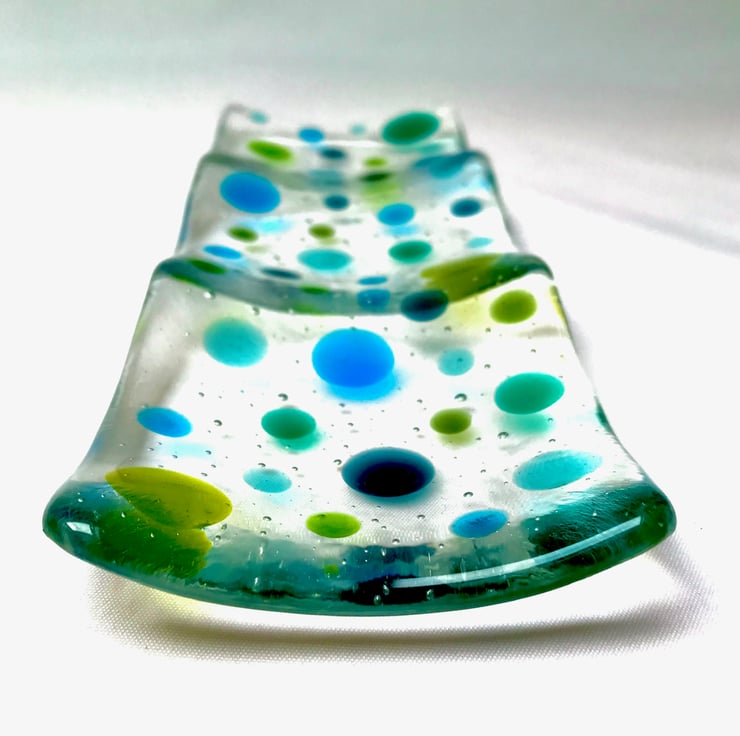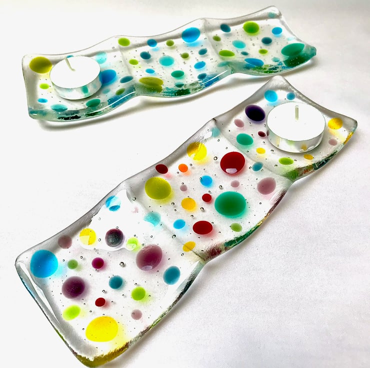 This fun glass tray has been made by fusing two pieces of hand cut clear glass with pre fired glass dots to create the vibrant polka pattern. Every single dot is a hand cut piece of glass which has been fired before being placed on the clear base. The individual pieces are fired to 800 degrees Celsius to fuse into one solid piece before gently cooling. It is then placed over a mould and refired at 670 degrees Celsius to take the shape of the tray. It is perfect as a tea light tray or to play on your dresser as a jewellery or trinket dish. It measures approximately 223mm by 75mm and stands 20mm high.