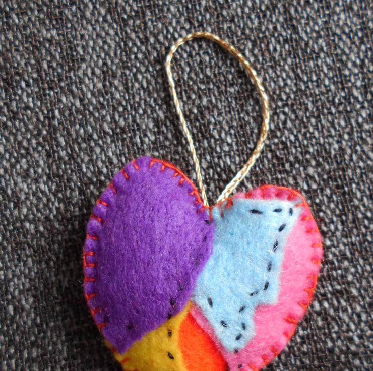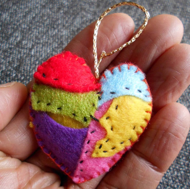 I use my felt fragment offcuts which I sew together by hand. Each heart is one of a kind, but a similar one can be made with the same colours. If you'd like something similar to those shown in the photo, please select the relevant letter next to the heart you're interested in, and I will try to use as many of the same colours to make your heart. Please note, that the shape of the fragments will vary. The back of the heart is made of red glitter felt (one piece or in patchwork).