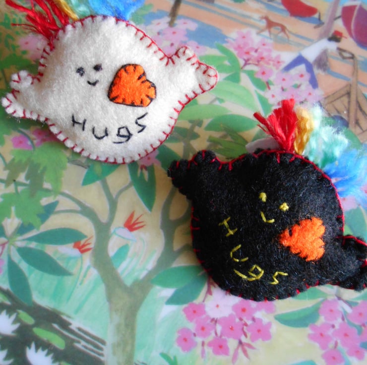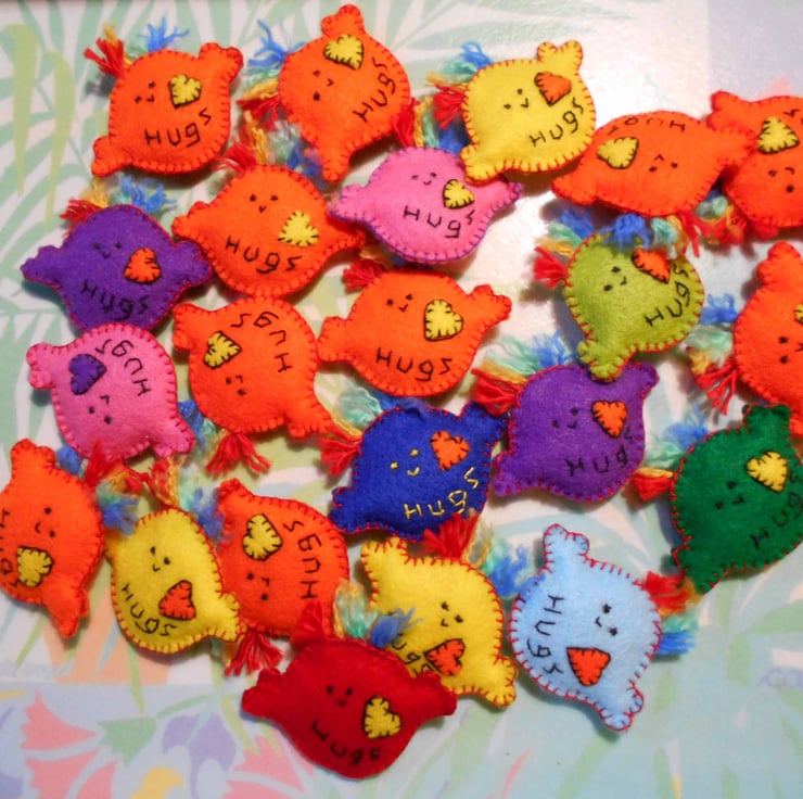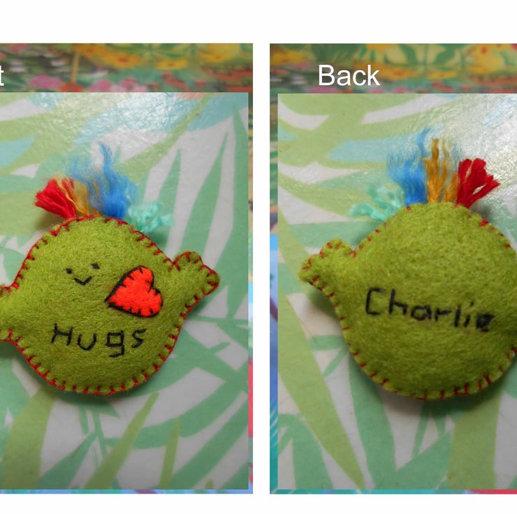 These cute 'hugs' are made of felt, with handembroidered detail. I can handembroider a name on the back.