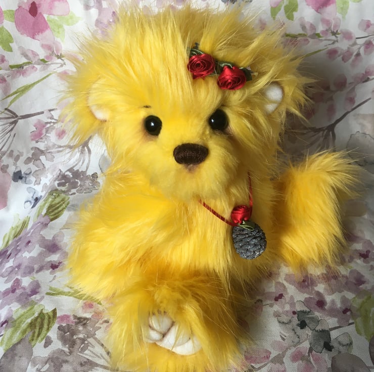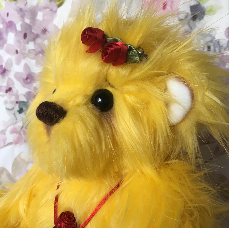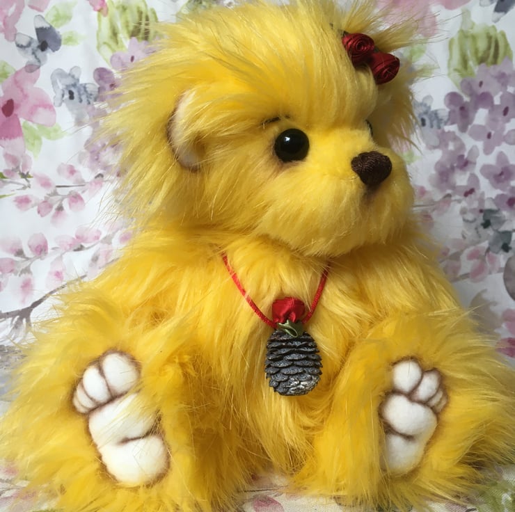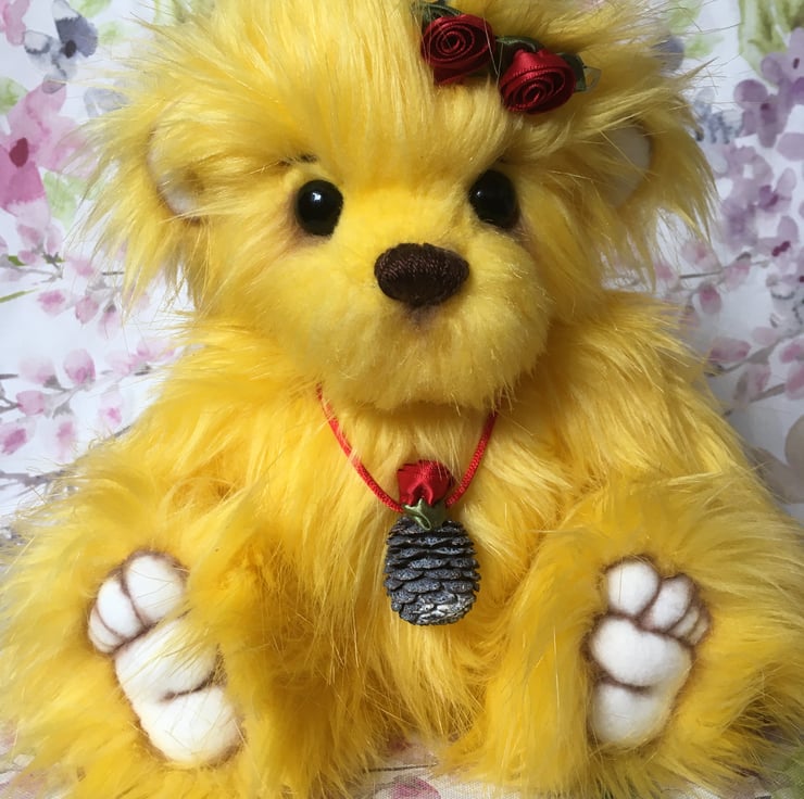Saffy is a beautiful yellow bear with a gorgeous rose hair clip and little pine cone around her neck, she believes that they bring her luck.