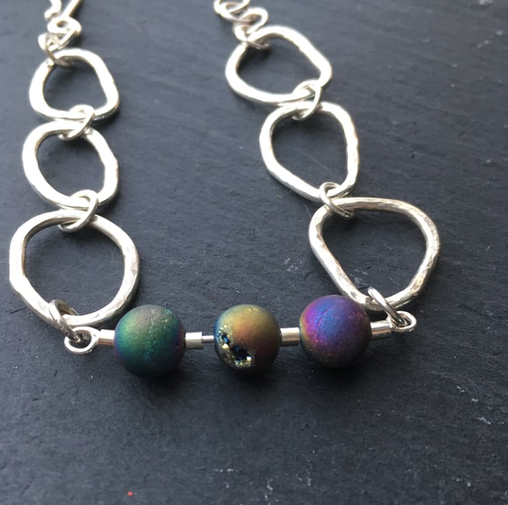 A unique and stunning bracelet made with sterling silver and gorgeous Rainbow Druzy beads.