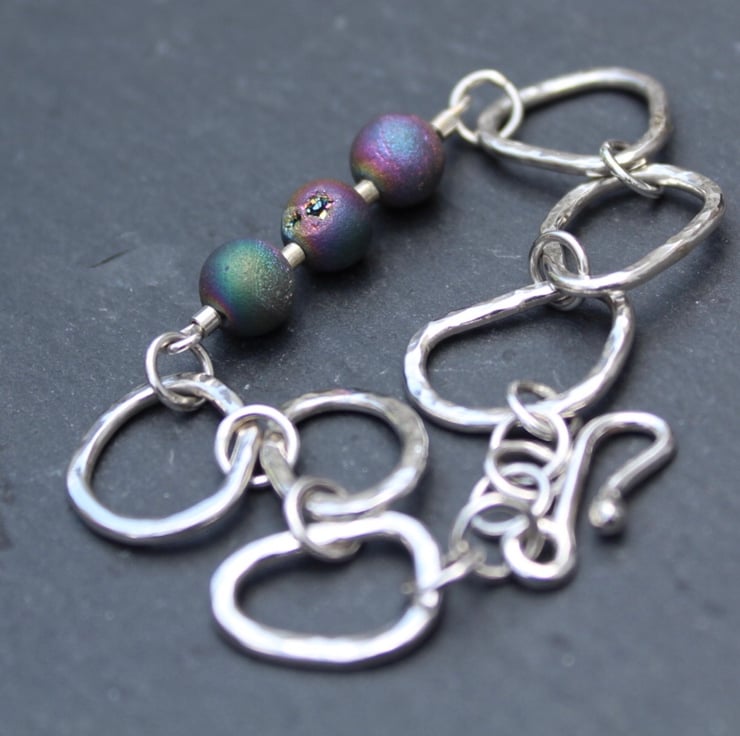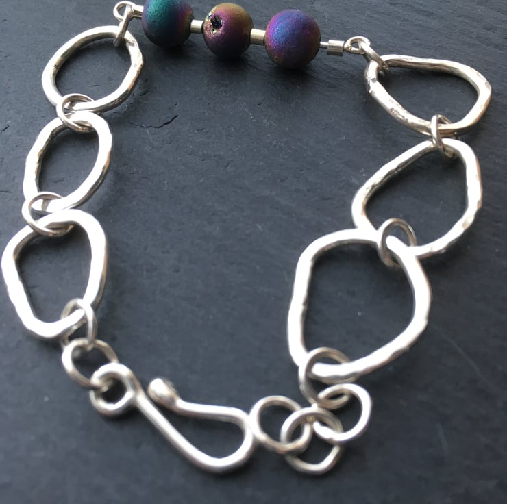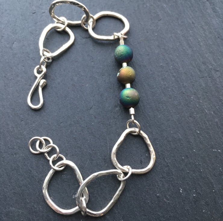 Each irregular shaped link is made by hand and joins a hand made sterling silver bar with 3 beautiful beads.