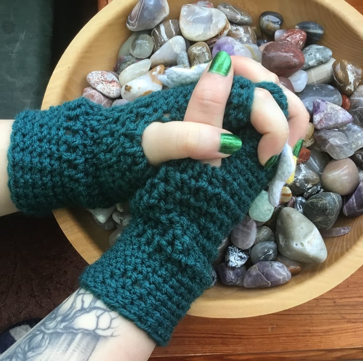 These lovely deep green fingerless mittens would be perfect for the spring!
