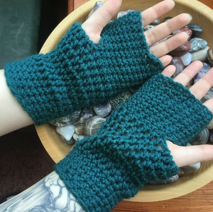 The yarn for these crocheted fingerless mittens is a beautifully soft and is 100% acrylic yarn. No animal fibres suitable for vegans or those allergic to wool.