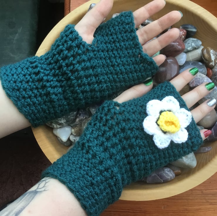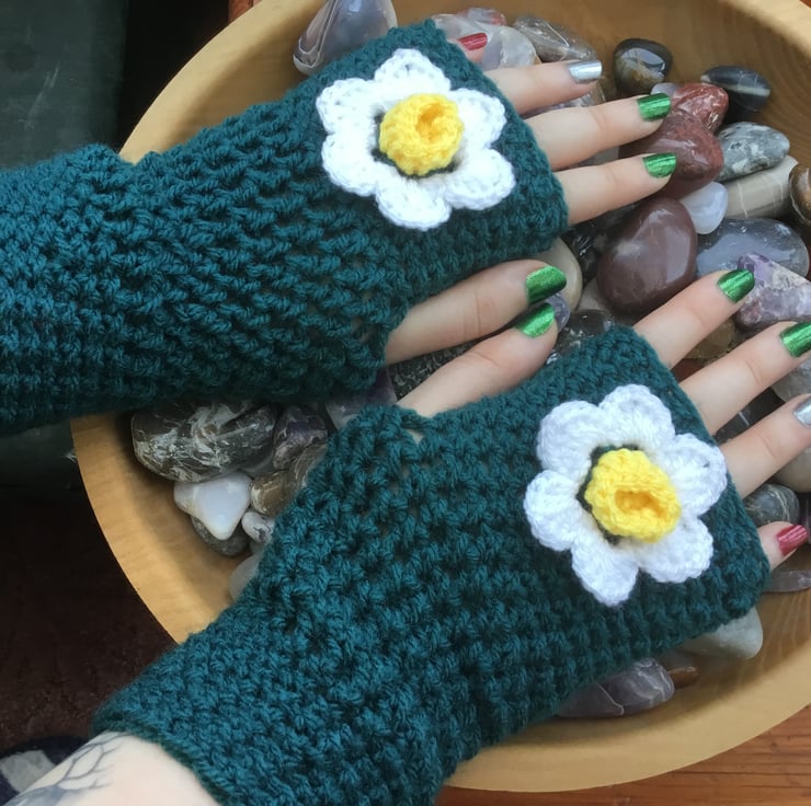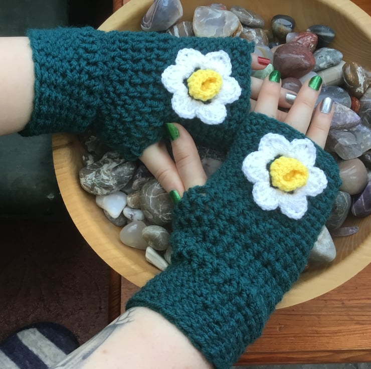 This is a classic style, with my own design touch, making them unique. Crocheted in a circular continuous line, double stitch at the finger edge, and triple around the hand, working towards the wrist at the top, where I have changed to double stitch again to bring the mittens in around the wrist. The Daffodil is crocheted separately and secure sewn to the top of each mitten.