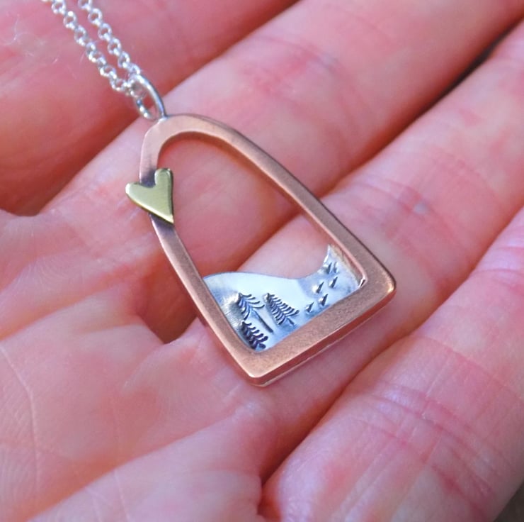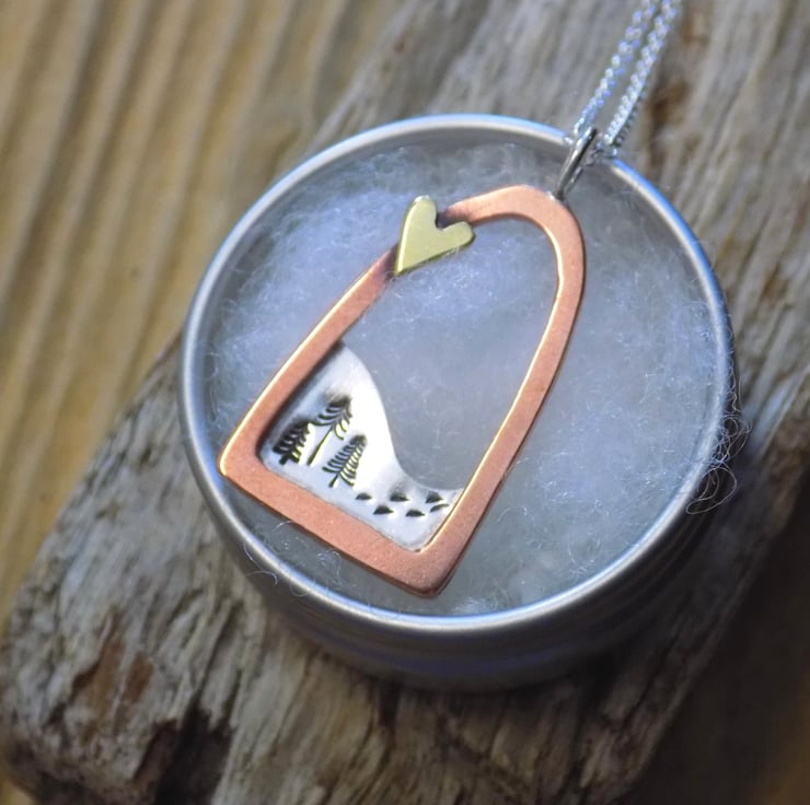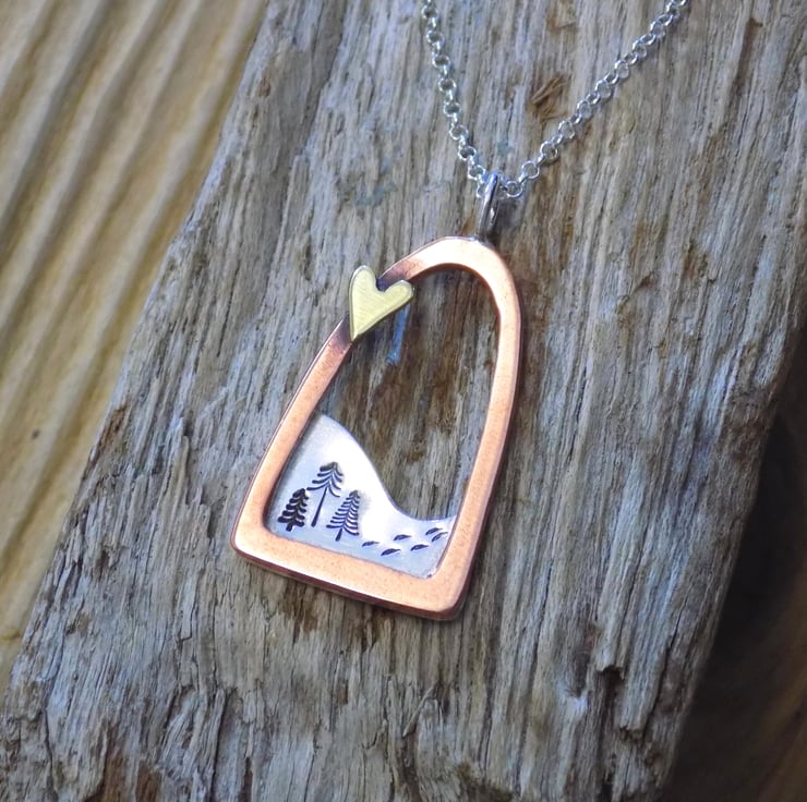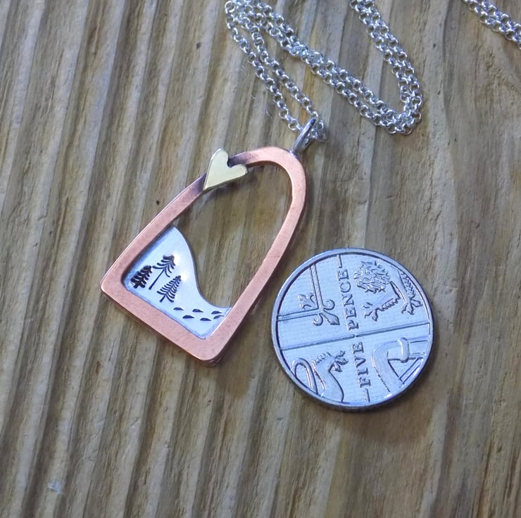 The frame has been sawn out from thick copper sheet ,filed and sanded smooth. The silver sheet has been soldered onto the frame and contains a little snowy scene of alpine trees and tiny footsteps through the snow. Lastly a tiny brass love heart has been soldered to the edge of the frame to make it extra special ! Suspended from a sterling silver 16 " belcher chain.