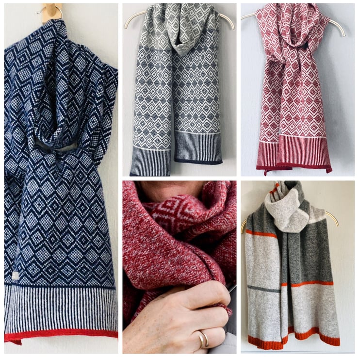 This knitted British spun soft merino lambswool Scandi scarf is just enough to keep out the chills and is beautifully soft and cosy. Can be worn draped round the neck or tied into a loose knot. The Scarf pattern is simplified traditional Scandinavian pattern and colours.
