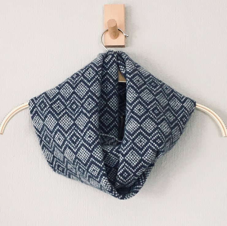 Cowl infinity scarf merino lambswool indigo blue and natural white