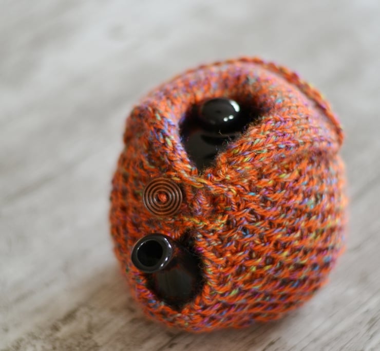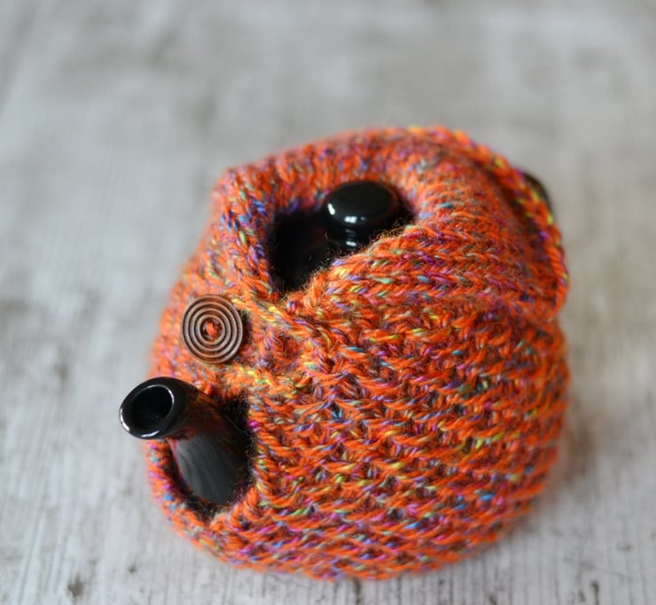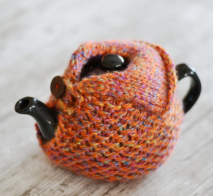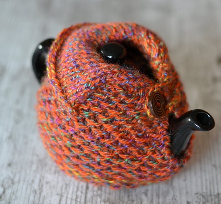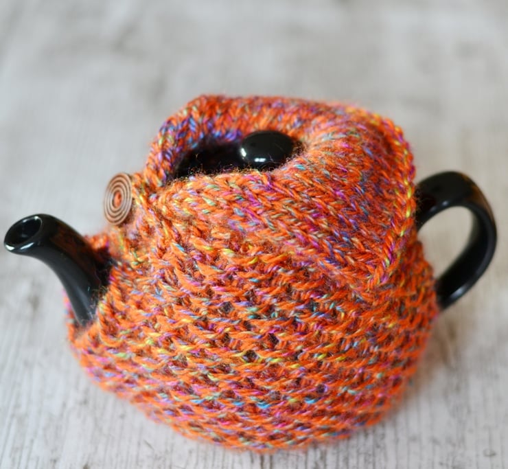 New design. Aran knitted teapot cover to fit 1-2 cup sized pots. Made in one of my own patterns in a big knit stitch pattern. Looks like it is wearing a cozy cardigan. Fasten with a wooden button across the top of the spout.
