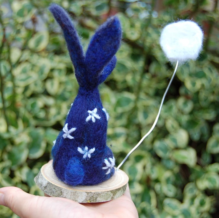 A beautiful needle felted blue hare gazing upwards towards the moon. Decorated with hand embroidered sparkly stars.