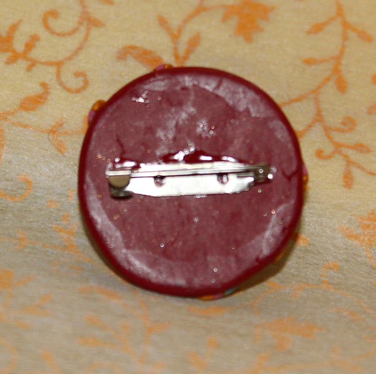 It is made from polymer clay, excellent and durable stuff that will keep its lush tones forever Measures 4.6cm across and is approx. 0.8cm thick in the middle where it is thickest. It has a metal brooch pin firmly attached.
