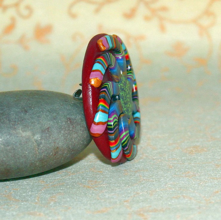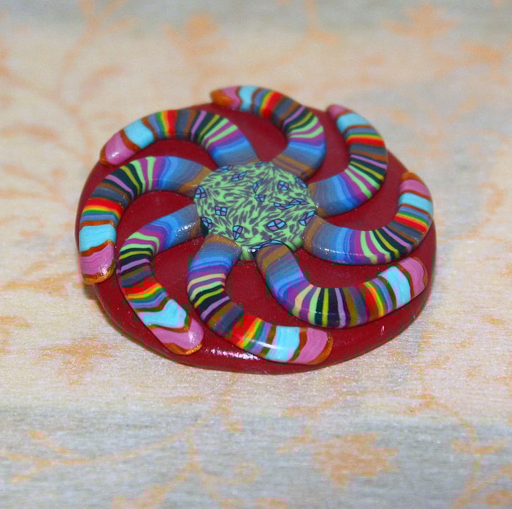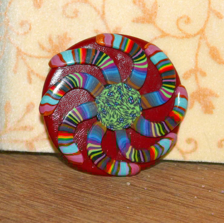 An interesting and unusual pin brooch - like a spiral of rainbows !. It is an an entirely unique and original piece - crafted and designed by myself. Would look very charming pinned to a lapel, or bag, or strap, or maybe hat.