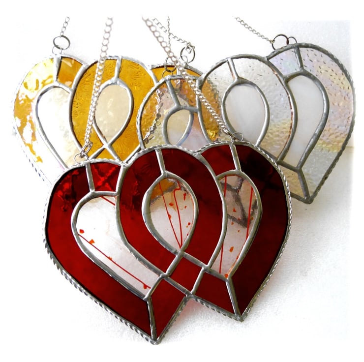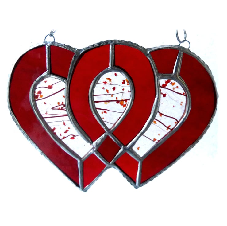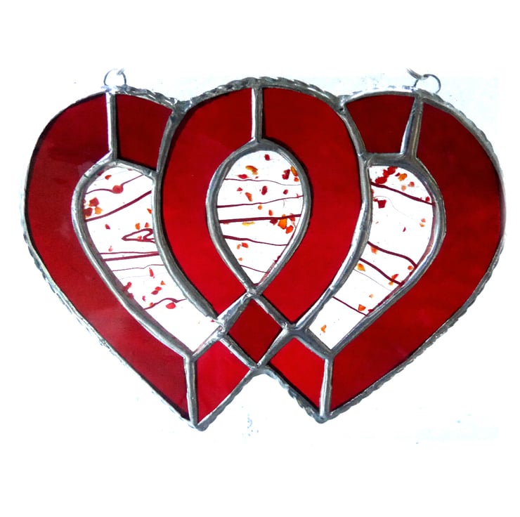 I've used red textured and water glass for the 2 hearts to give lots of sparkle and infilled with some rather prettily patterned fusung glass.