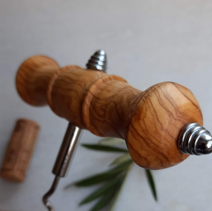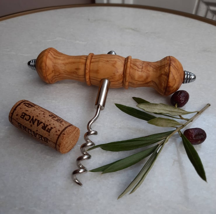 This is a handmade, woodturned corkscrew made from Venetian Olive wood - a beautiful golden wood with a stunning grain pattern. The shape of the corkscrew allows easy holding and this would be a beautiful addition to any kitchen. It is a substantial size, measuring over 12cm across.