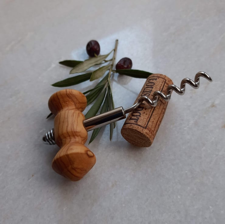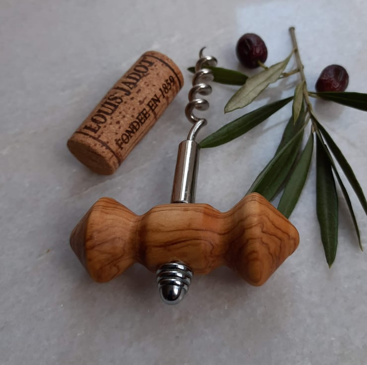 This is a handmade woodturned corkscrew made from beautiful Venetian Olive wood - a stunning wood with an interesting grain pattern. This would be a wonderful addition to any kitchen. It is a smaller piece, measuring less than 10cm across. The shape provides an easy hold for removing corks!