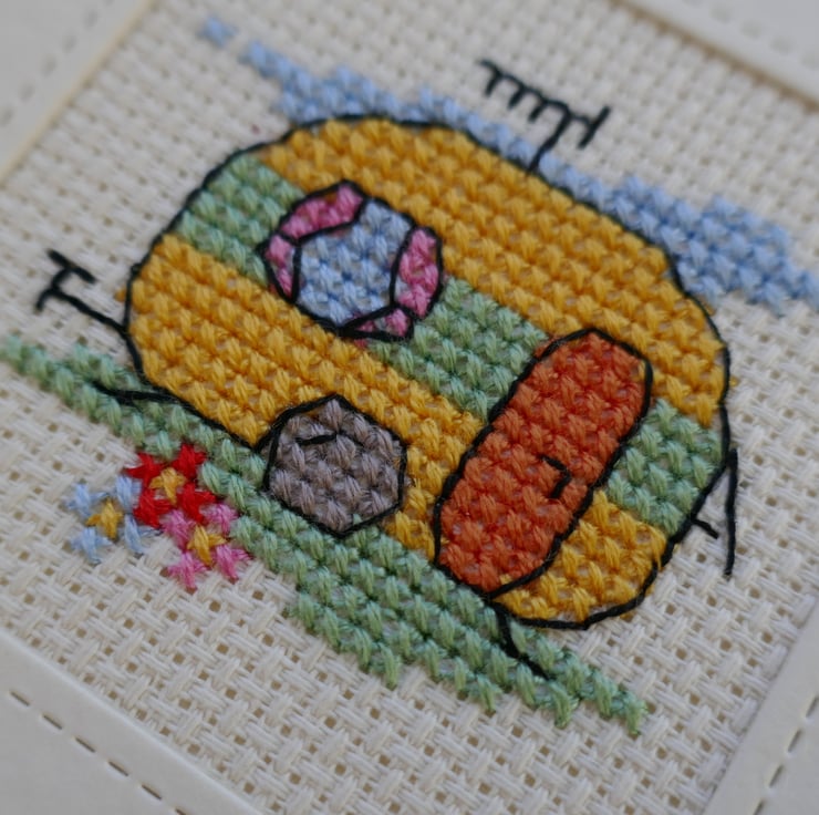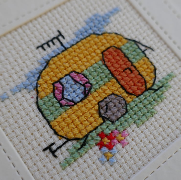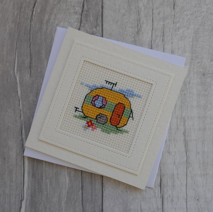 The cross stitch Caravan is from a design by Mouseloft. The caravan has been stitched in yellow and green threads, with pink curtains and an orange door. There is a small patch of green grass below the caravan with three small flowers. The image has been outlined in black thread. The cross stitch has been mounted behind a cream hammer frame that has been cut with stitched square dies before being attached to the centre of the card.