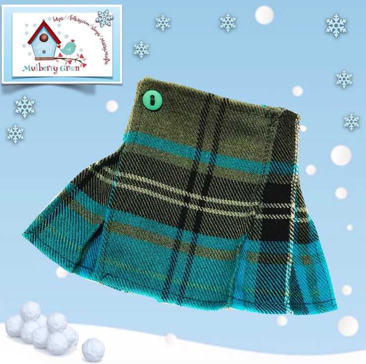 A lovely little hand pleated tartan kilt fit the Mulberry Green characters, in a lovely turquoise and grey tartan.