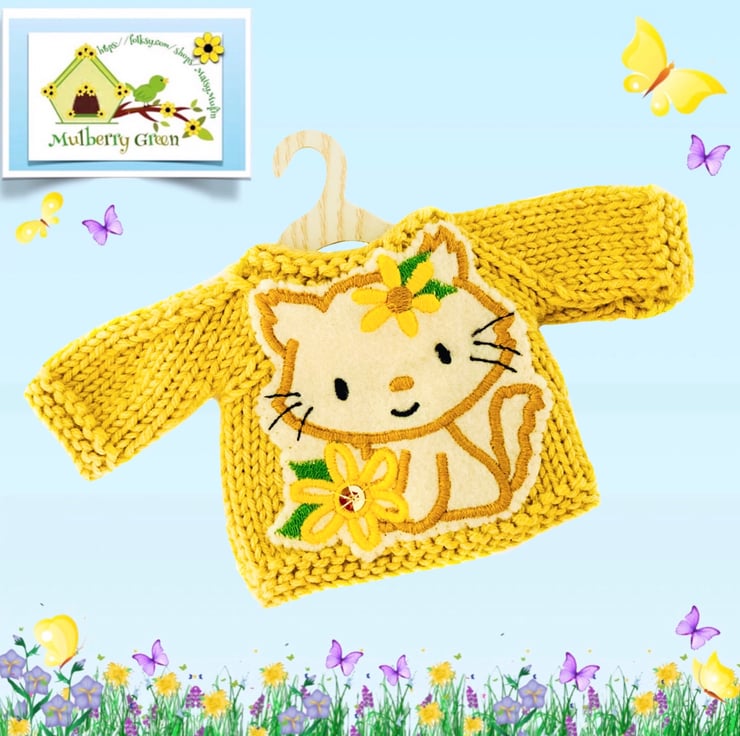A lovely little jumper, embroidered with a very cute little kitten, made especially to fit the Mulberry Green dolls. It comes on a little wooden hanger.