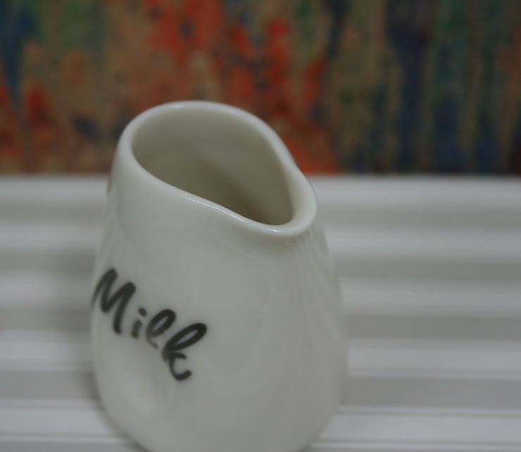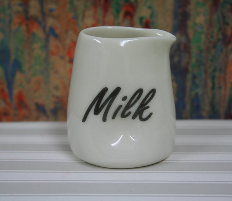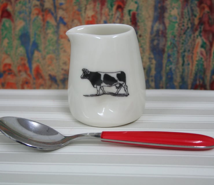 A hand thrown and glazed porcelain jug with a cow image on one side and milk wording on the other side. The sides of the jug have been pinched in during the making process to allow ease of picking up the jug. The transfers are fired on at 800 degrees centigrade and are dishwasher / microwave / oven proof. Approximate measurements are 6cm tall and 5cm wide. It holds about 75ml. Please note these dimensions may vary slightly as they are hand made on a potters wheel.