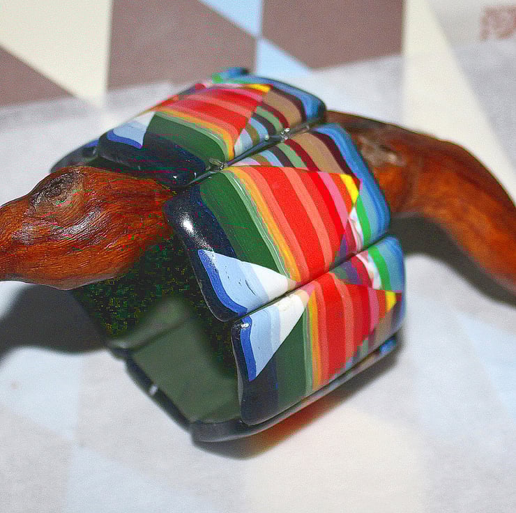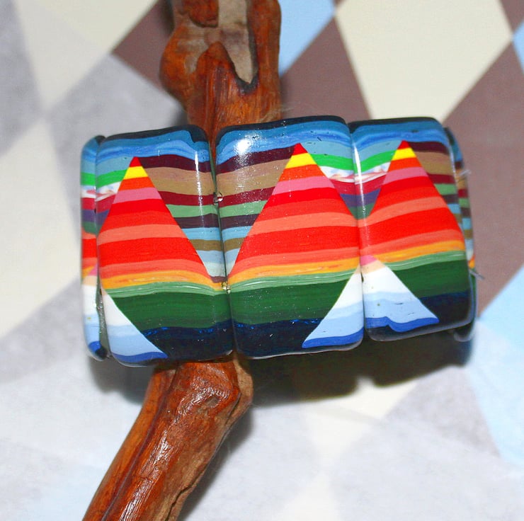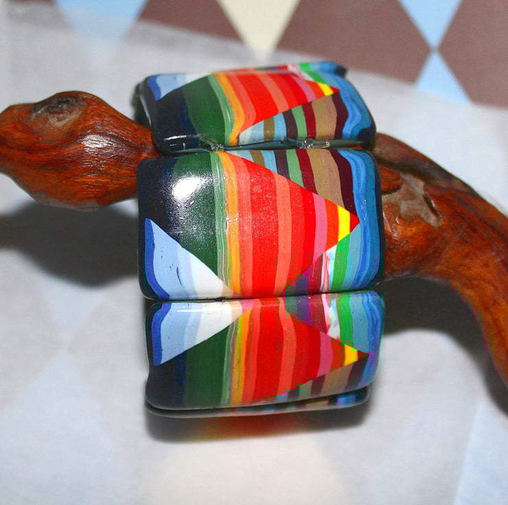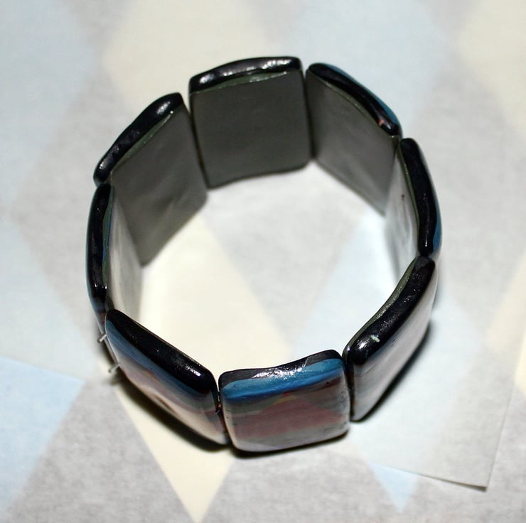 Made of 8 tiles of polymer clay, designed and crafted by myself, these are linked together on 2 threads of unbreakable stretchy elastic.
