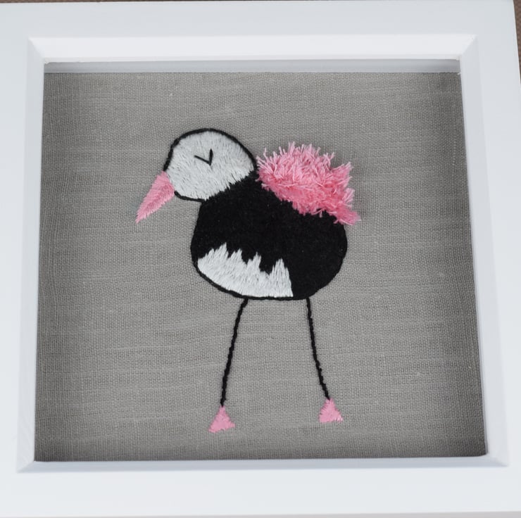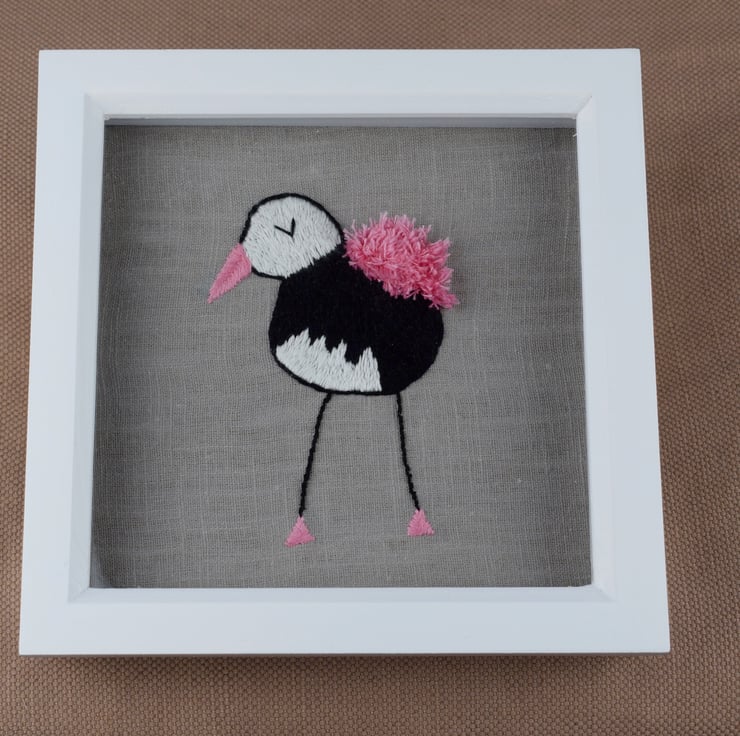A delightful, characterful hand embroidered bird with a pink, fluffy wing set on a natural linen background. The bird comes in a white shadow box frame which can be hung on the wall. The frame is 19cm x 19 cm (7.5" x 7.5").
