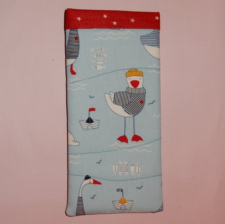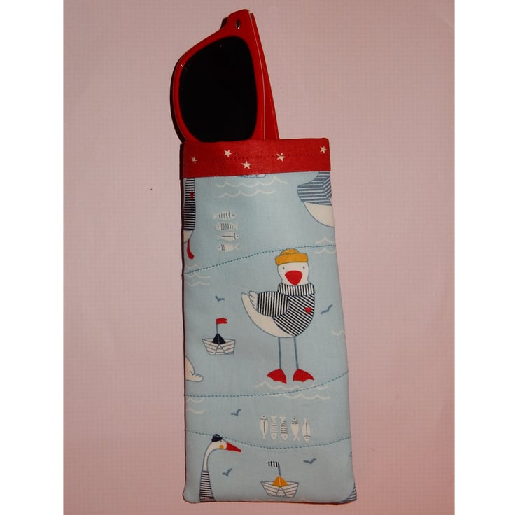 Cute seagulls, boats and a lighthouse feature on this handy case for your glasses or sunglasses. It is made from a cotton print fabric with a toning star print lining. It also has a layer of wadding for protection. This is a slip in style glasses case, if you require a case which fastens please view my other listings.