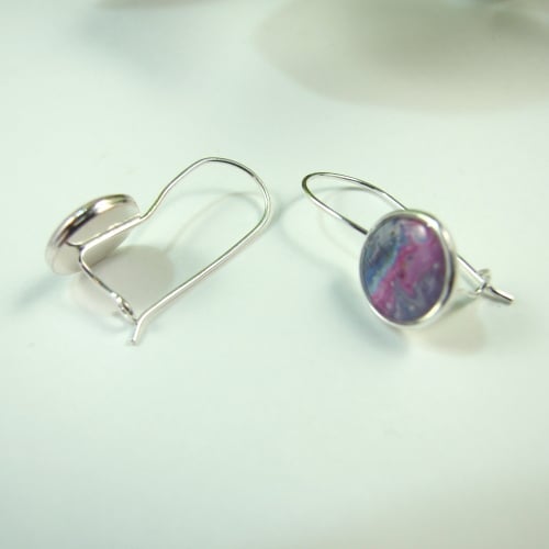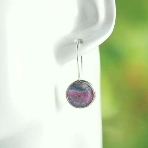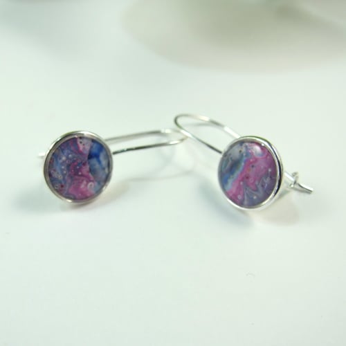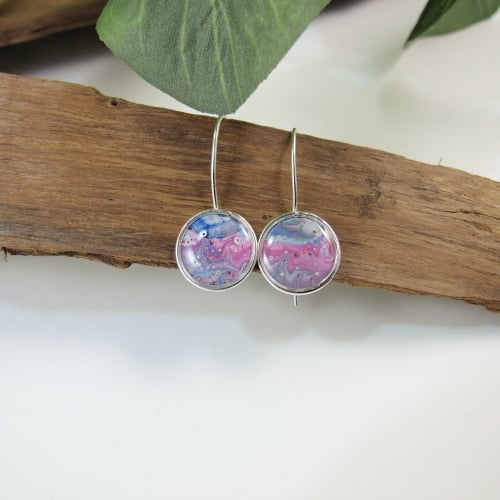 The silver earrings feature original 'poured' acrylic artwork or fluid art, created by mixing tiny amounts of different coloured acrylic paint with a special medium and pouring it over a canvas to create the most wonderful patterns, this truly is a one off pair of earrings as you could never create the same pattern. The resultant painting is shades of Pink and Blue.