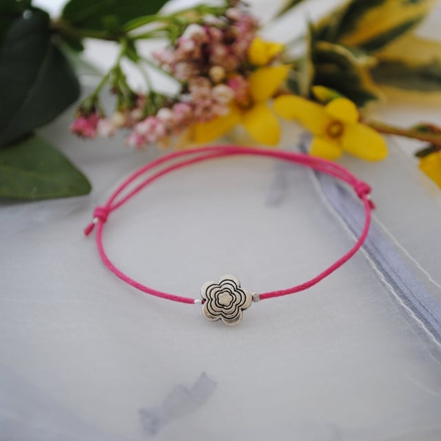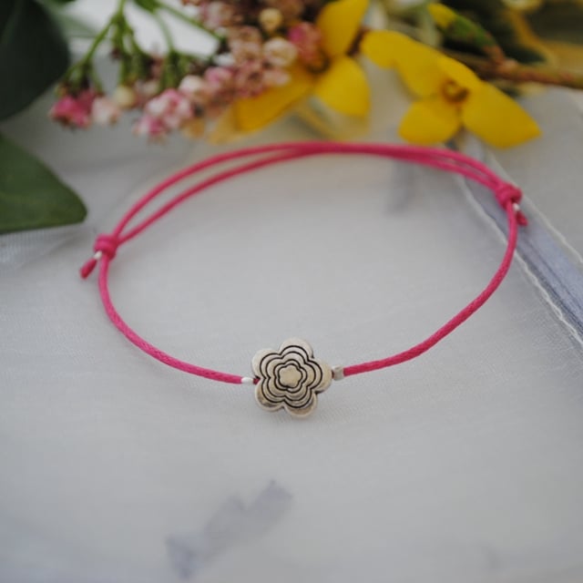 A simple cord friendship bracelet made with hot pink / fuchsia waxed cord with a silver flower.