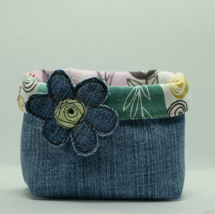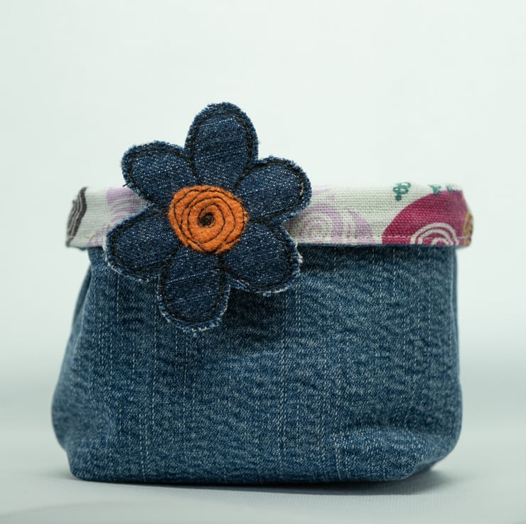 Made from repurposed denim and lined with contemporary stylised leaf design 100% cotton fabric. Interlined with interfacing to provide the structure.