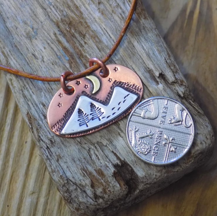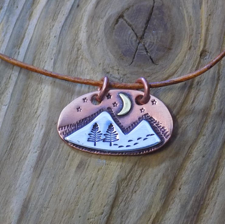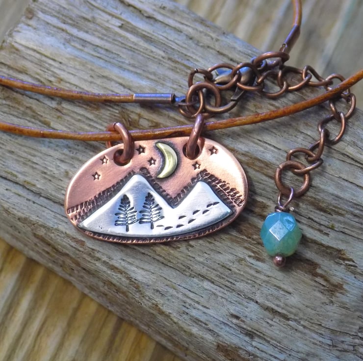 Made from 1.2 mm copper and a layer of sterling silver sheet. The layer of silver mountains have been carefully soldered to the bottom of the pendant which has little footsteps wandering through the snowy forest. A little brass crescent moon, and stars set the scene. Simply hung on an adjustable vintage brown leather necklace with extender chain with weighted pale green bead 16-18 ".