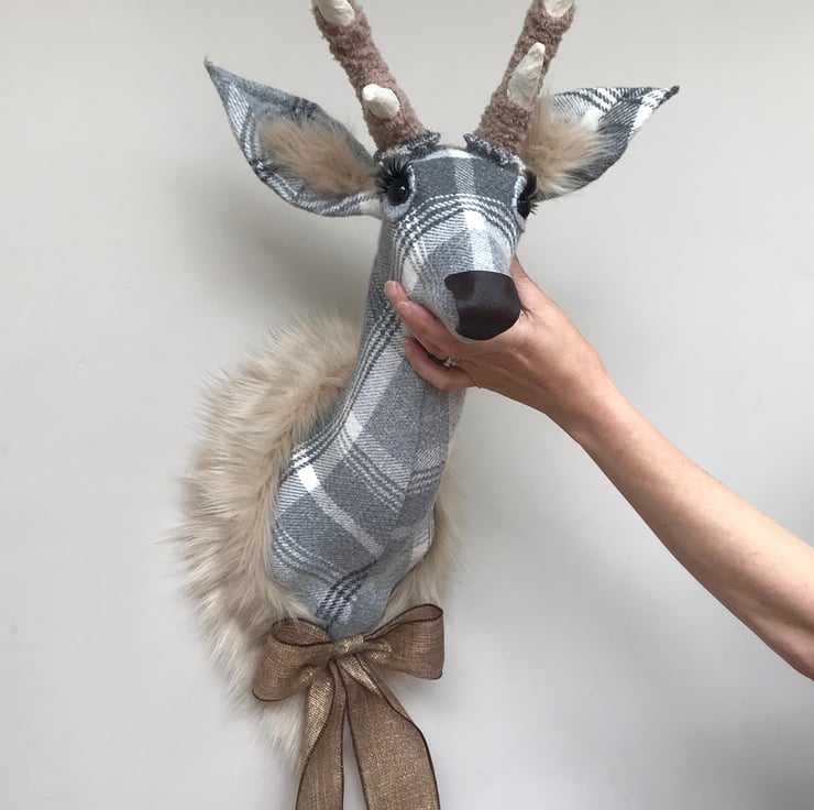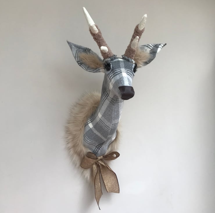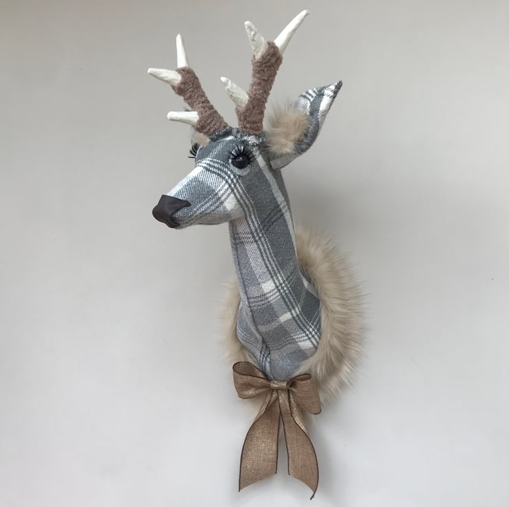Welcome to my listing of a gorgeous grey check handmade stag head. An elegant stag with a more natural appearance, with its slightly curved and elongated neck, a statement piece for any wall.
