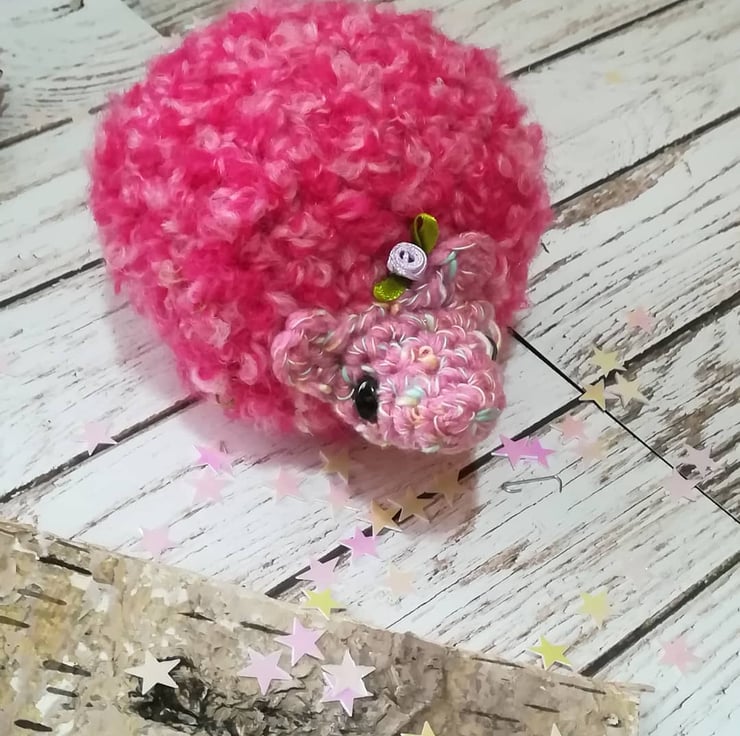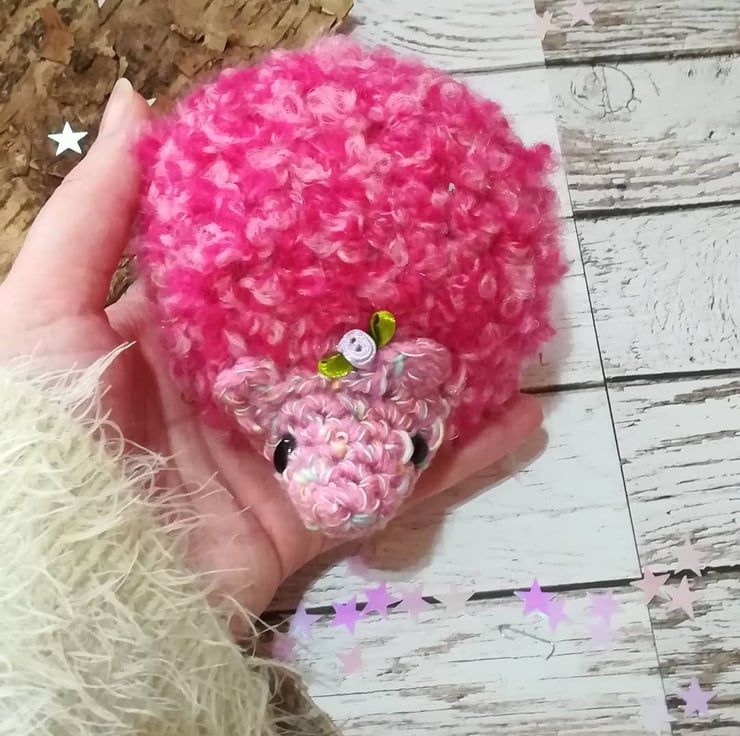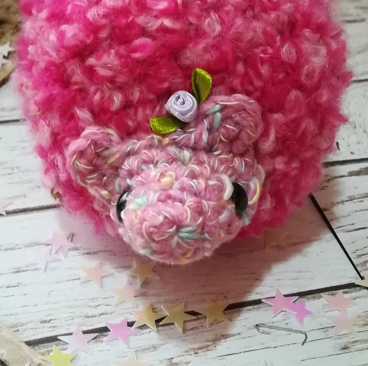 This pretty little puff is made using a lovely soft yarn, it has a little flower.