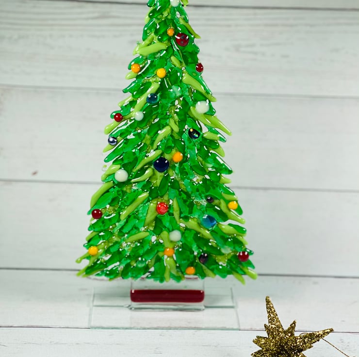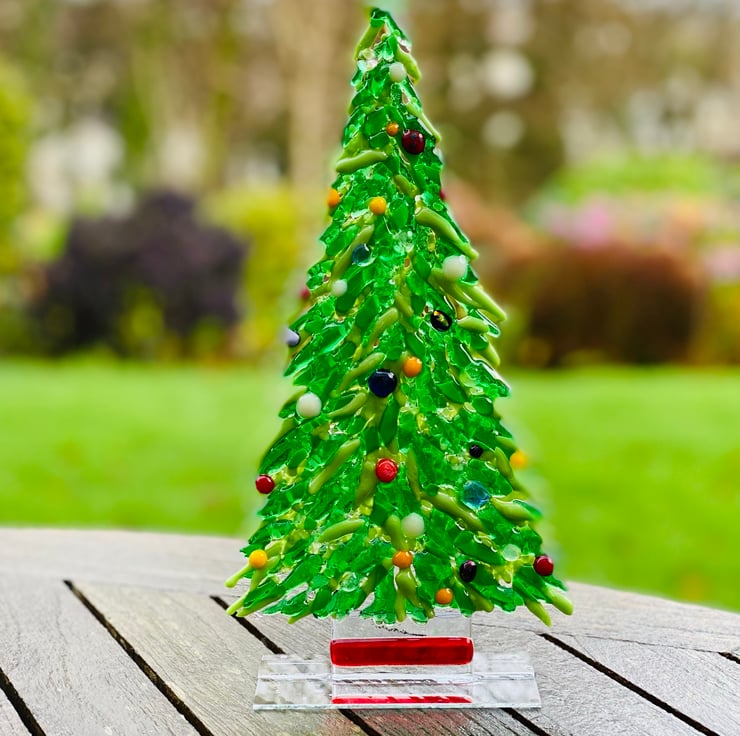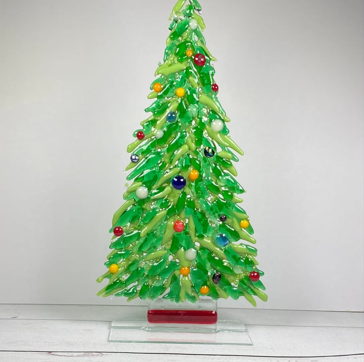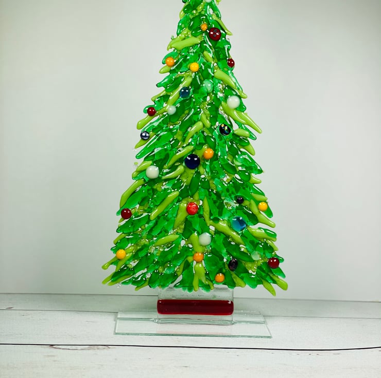 This fused glass Christmas tree is a mix of transparent and opaque green glass with colourful baubles . It looks wonderful on a mantle piece or window sill . The tree is on a flat glass base and is free standing.