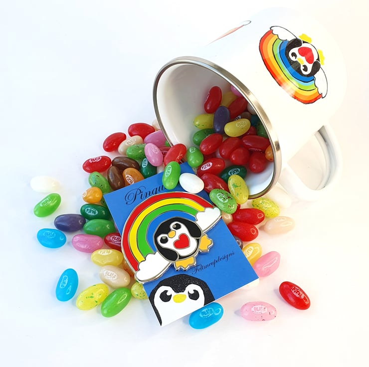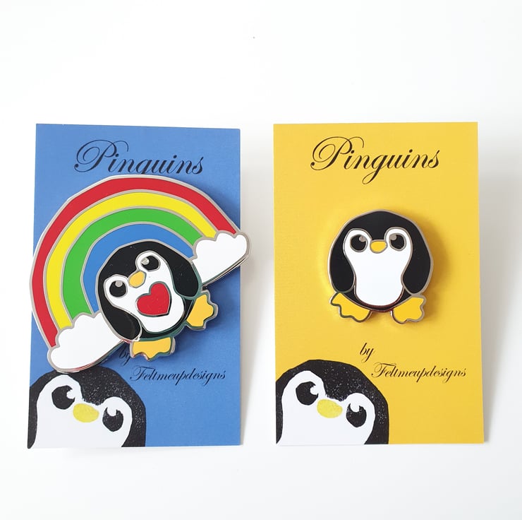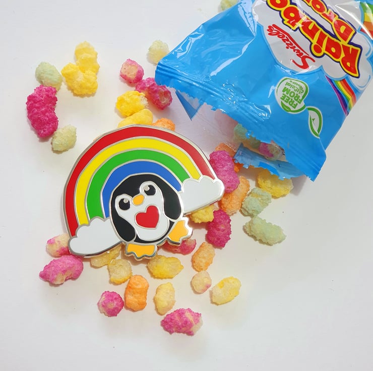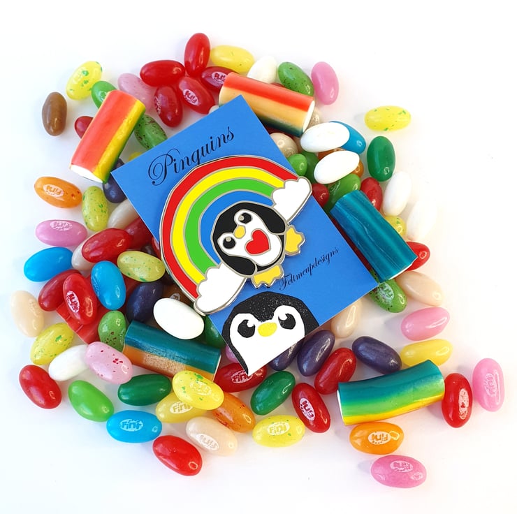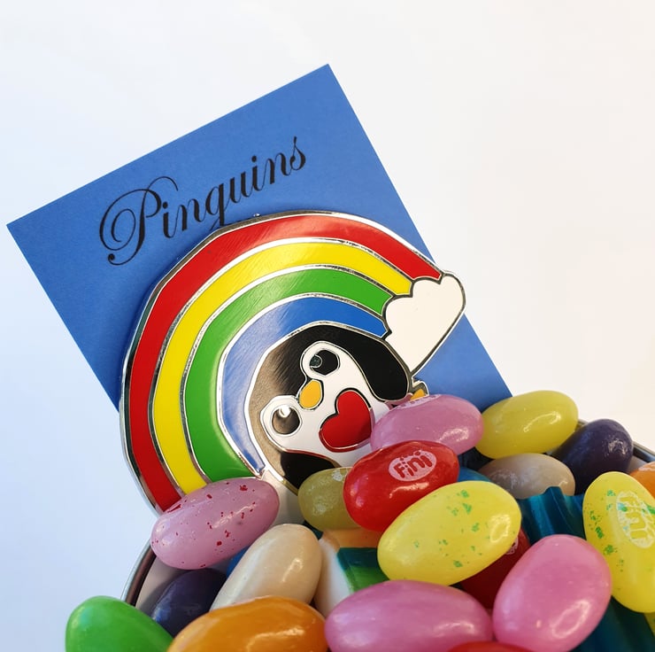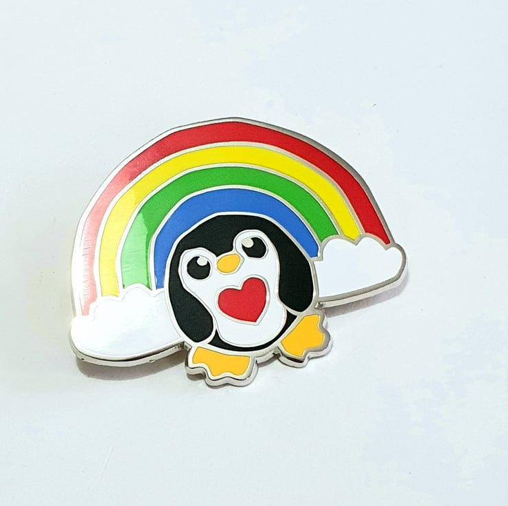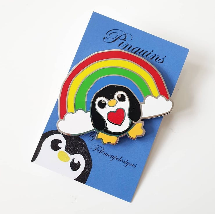 Awesome Epic Rainbow Penguin Pin. This most massive of pinguins features my lovely rainbow penguin in all his rainbowy glory and comes with his own mini print. Perfect to brighten the darkest of days.