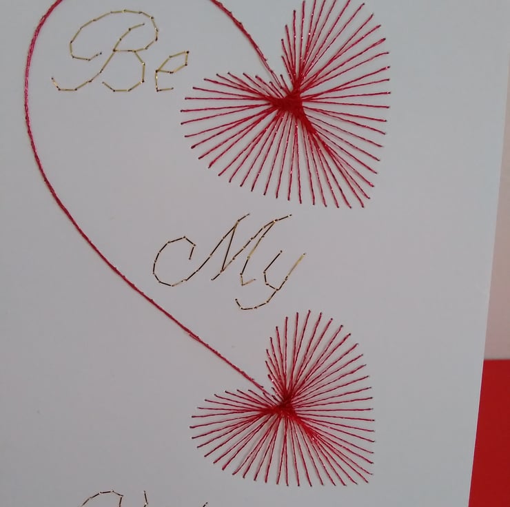 A lovely card for valentines day, hand embroidered in red and gold metallic thread on a white card.