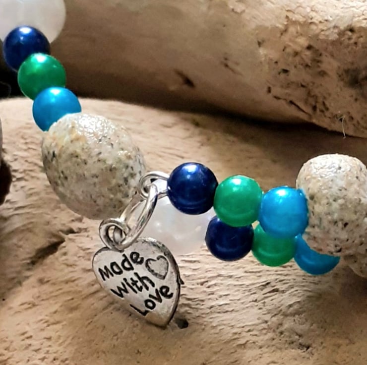 This is a unique memory wire bracelet featuring sand beads which are beads made using sand ..in this case I have used sand from Porth beach Newquay in Cornwall each bead is moulded and shaped set hard and waterproofed and protected with durable varnish...also included in the bracelet are pretty acrylic beads and little heart charms with the inscription "made with love " ....the bracelet is expandable so should fit any adult wrist.I would advise that although the sand beads are well protected not to wear in water for any length of time . Would make lovely unique special gift ...very pretty and comfortable to wear bracelet