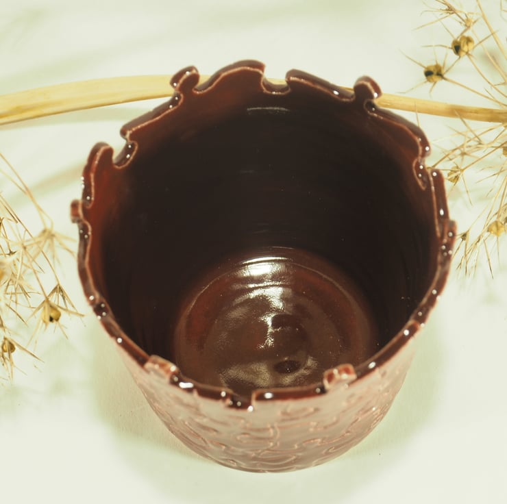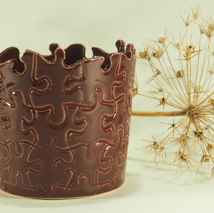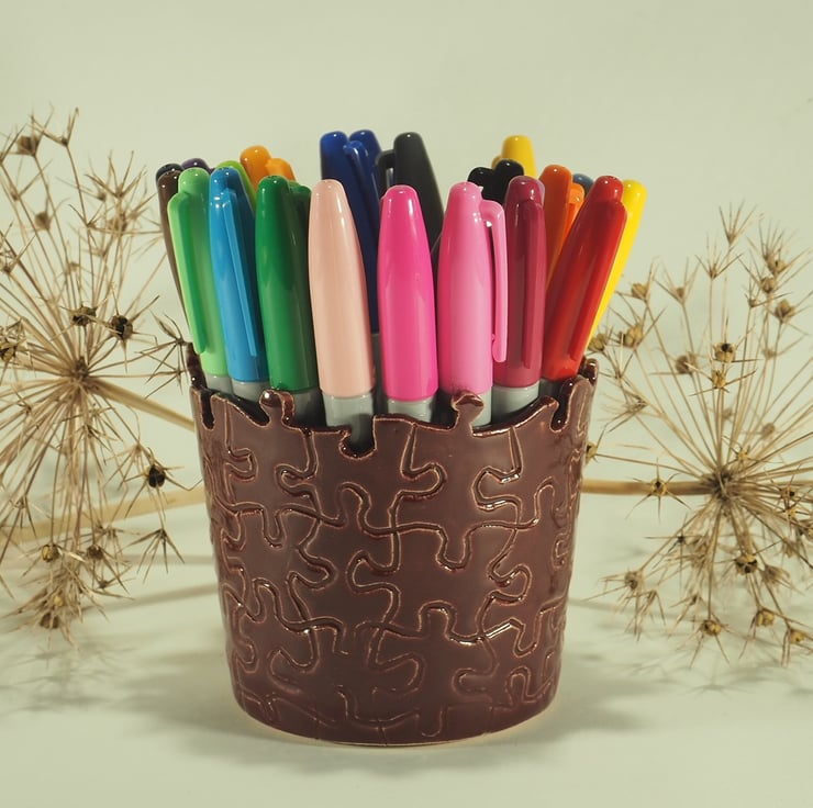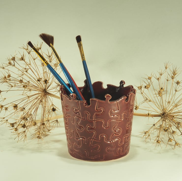 A pot with a difference! This little pot has been cut and scored to look like a jigsaw. The top edge has been cut with a wire (just like a real jigsaw) and the design extends down the outside of the pot to create a design of interlocking pieces. The pot has been glazed in a dark red/maroon glaze which runs off the edges to show the detail of the carving. (Pens not included !)