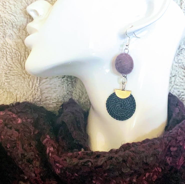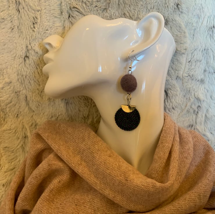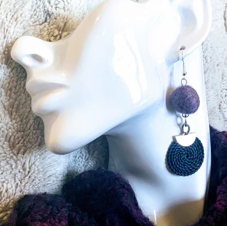 Dust lilac felted wool ball earrings featuring satin purple and green spirals. Very light weight.