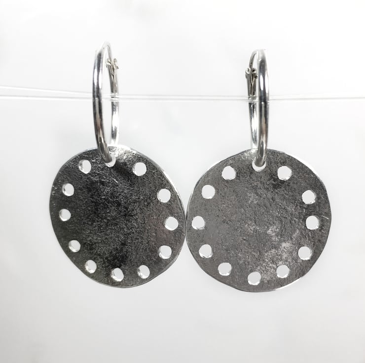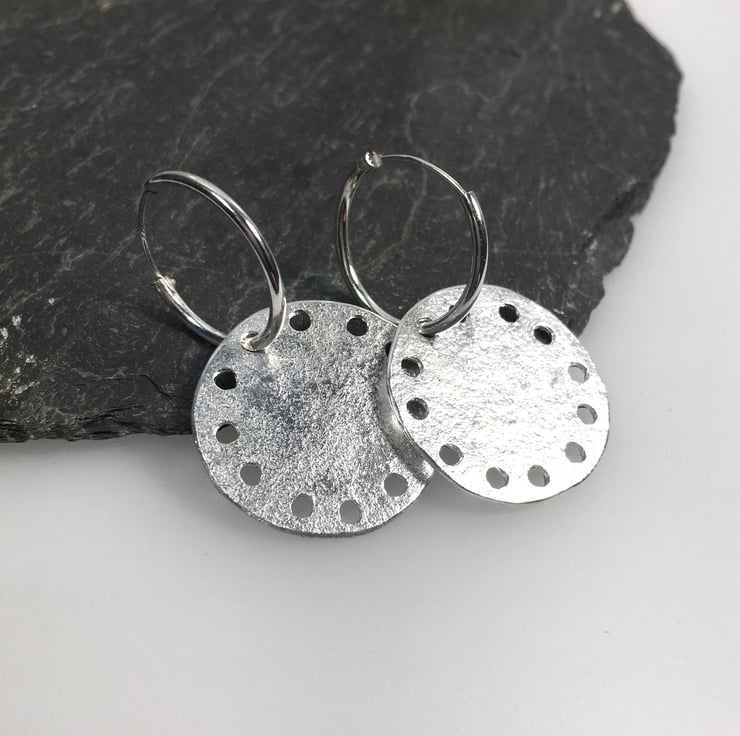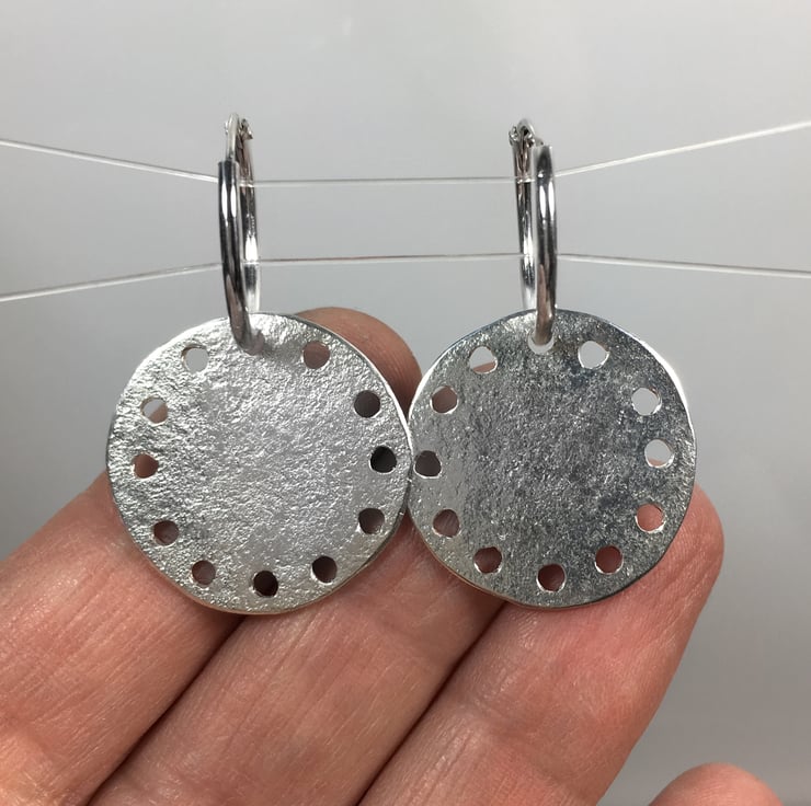 Large fine silver disc earrings with drilled detail hung from sterling hoops.