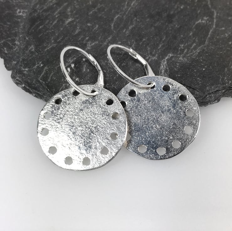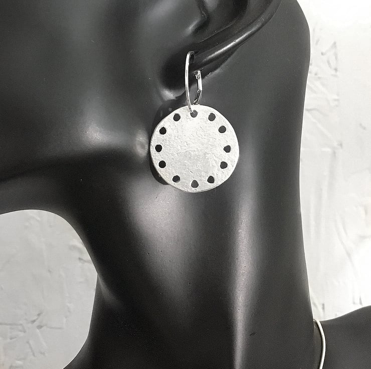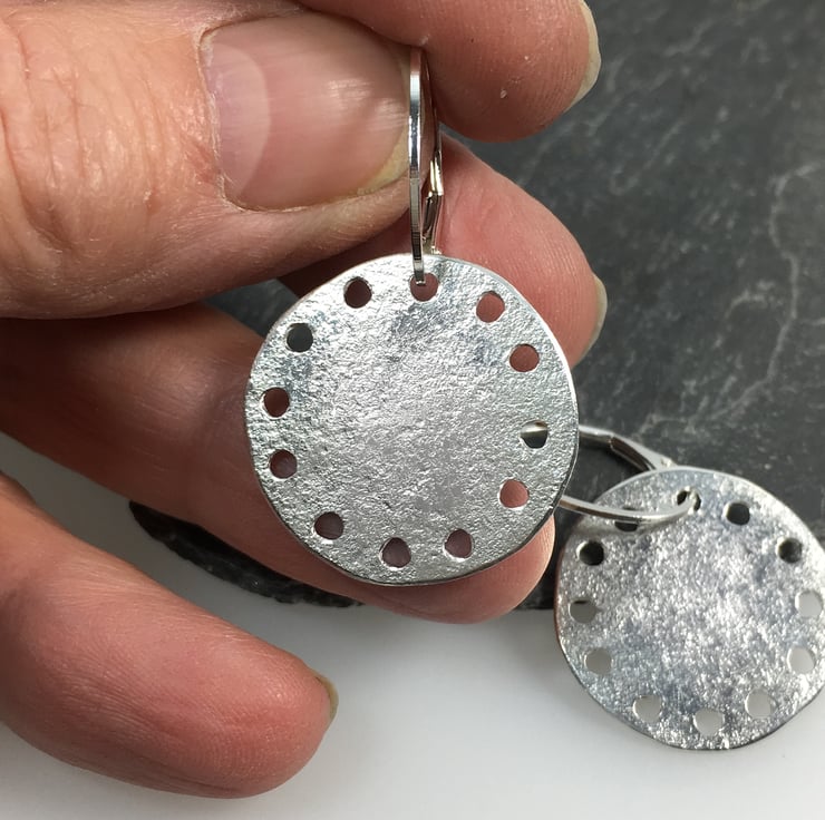 The silver discs have been given a weathered beaten texture. They have a ring of drilled holes around the edge to add interest. The metal has been rubbed to a subtle shine.